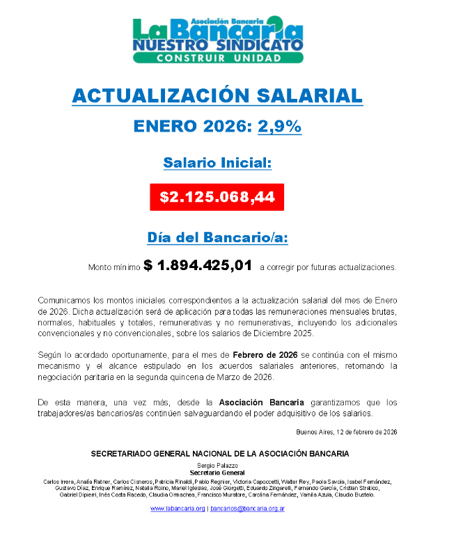 Con esta actualización, el ingreso mensual inicial de los trabajadores bancarios pasó a ser de $2.125.068,44 a partir de enero. El gremio precisó que “dicha actualización será de aplicación para todas las remuneraciones mensuales brutas, normales, habituales y totales, remunerativas y no remunerativas, incluyendo los adicionales convencionales y no convencionales, sobre los salarios de diciembre 2025” .