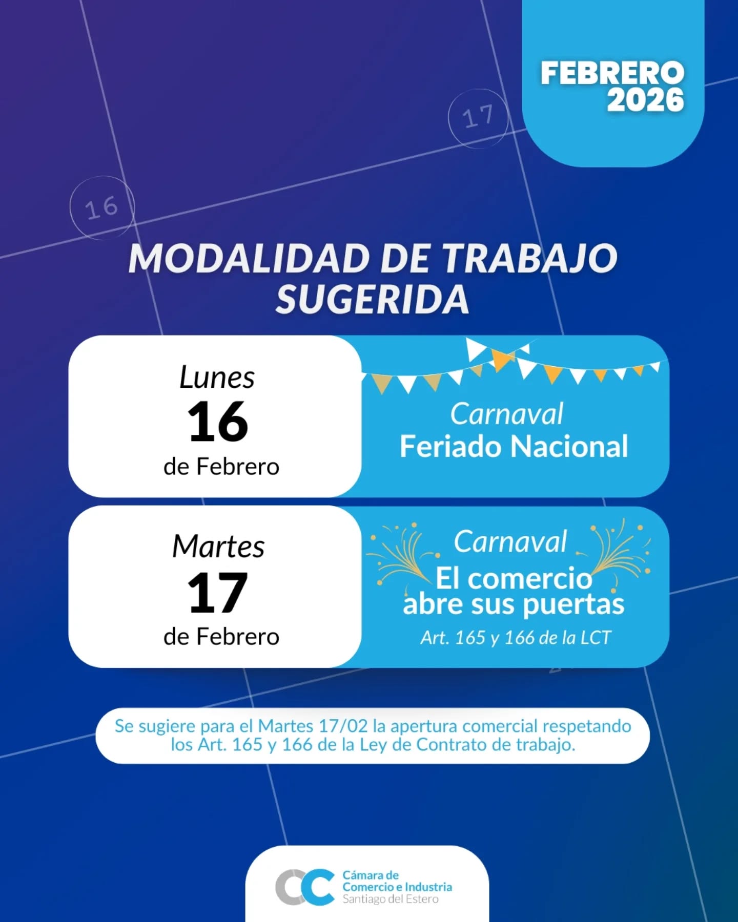 La Cámara de Comercio e Industria de Santiago del Estero comunicó oficialmente el esquema de atención recomendado para los comercios de la provincia durante los feriados de Carnaval, que se celebrarán el lunes 16 y el martes 17 de febrero. La entidad busca de esta manera brindar previsibilidad tanto a los comerciantes como a los consumidores en el primer fin de semana extralargo del año .