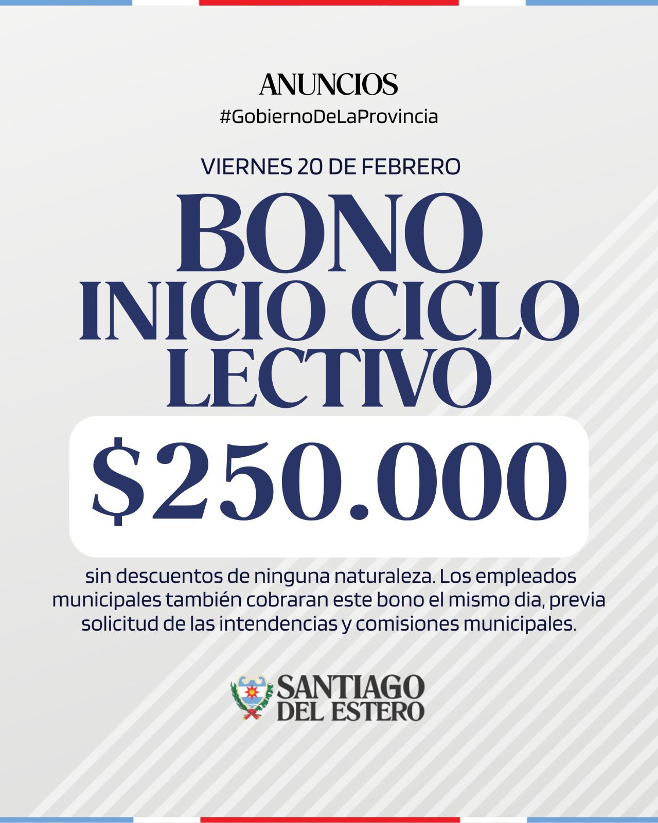 El primer pago será el Bono de Inicio de Ciclo Lectivo, que se abonará el próximo viernes 20 de febrero por un monto de $250.000, sin descuentos de ninguna naturaleza.