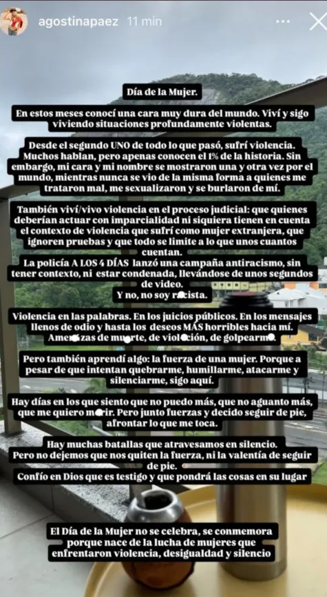 También cuestionó el proceso judicial y la exposición mediática del caso. “Quienes deberían actuar con imparcialidad ni siquiera tienen en cuenta el contexto de violencia que sufrí como mujer extranjera”, sostuvo.