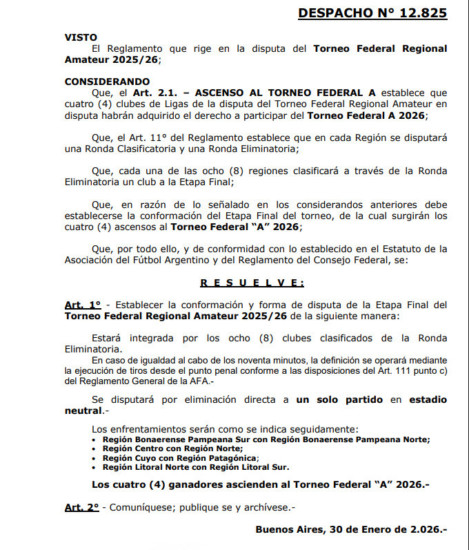 El Torneo Regional Federal Amateur entra en su etapa decisiva y ya quedaron definidos los cruces que determinarán los cuatro ascensos al Torneo Federal A 2026. La información fue oficializada por el Consejo Federal de la AFA, que estableció un formato de eliminación directa con encuentros únicos y en cancha neutral, lo que promete finales cargadas de emoción y paridad.