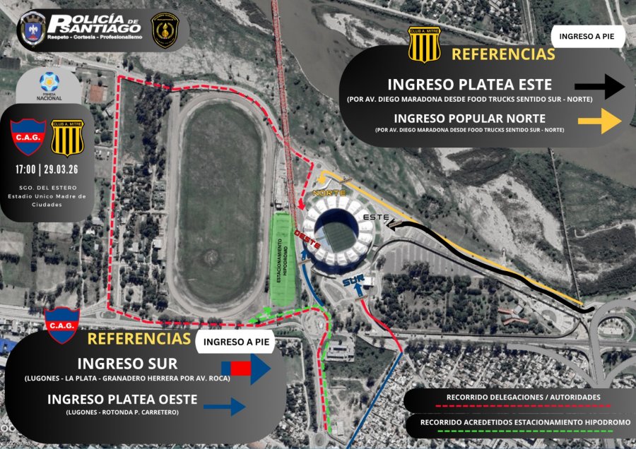 Para garantizar un espectáculo seguro, la Policía de la Provincia ha diseñado un exhaustivo operativo de ingresos diferenciados, con el fin de evitar el cruce de las parcialidades en las inmediaciones del parque Aguirre.