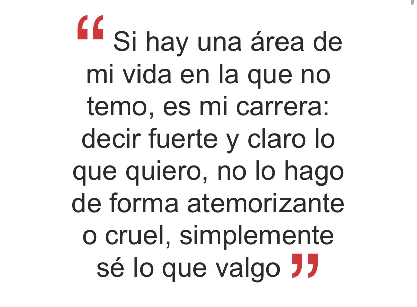 “Hubo un momento en mi vida, en mi carrera, en el que me di cuenta de que no se trata de ser agresiva, combativa, maliciosa o emocional para defender lo que mereces y lo que quieres. Es un músculo difícil de desarrollar. Y también ser querida y respetada. Es difícil de lograr”.