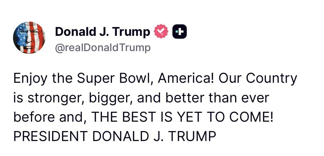 “¡Disfruten del Super Bowl, Estados Unidos! Nuestro país es más fuerte, más grande y mejor que nunca, ¡y LO MEJOR ESTÁ POR VENIR!”, escribió el republicano.