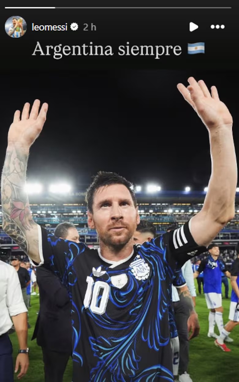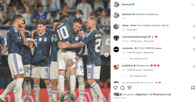 Tras el partido, en el que además convirtió un gol, Messi publicó una serie de imágenes del encuentro y acompañó el posteo con una frase breve pero contundente: “Argentina siempre”, junto a un emoji de la bandera nacional.