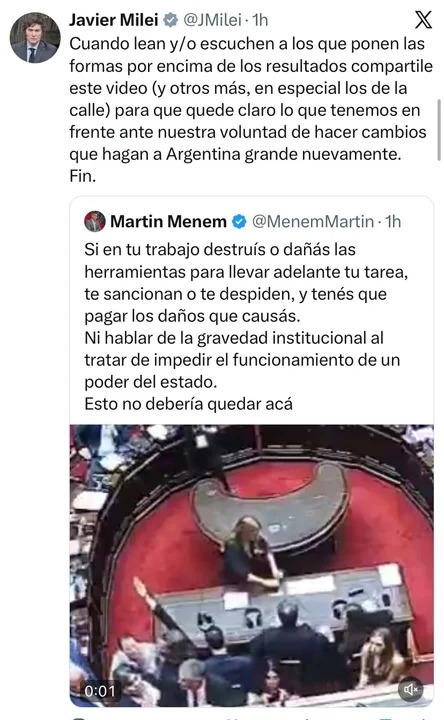 Vía X, Milei aprovechó para citar las imágenes y disparar contra la oposición más refractaria a su gestión, aquella que rechaza su agenda de reformas estructurales. “Cuando lean y/o escuchen a los que ponen las formas por encima de los resultados compartile este video (y otros más, en especial los de la calle) para que quede claro lo que tenemos en frente ante nuestra voluntad de hacer cambios que hagan a Argentina grande nuevamente”, expresó.