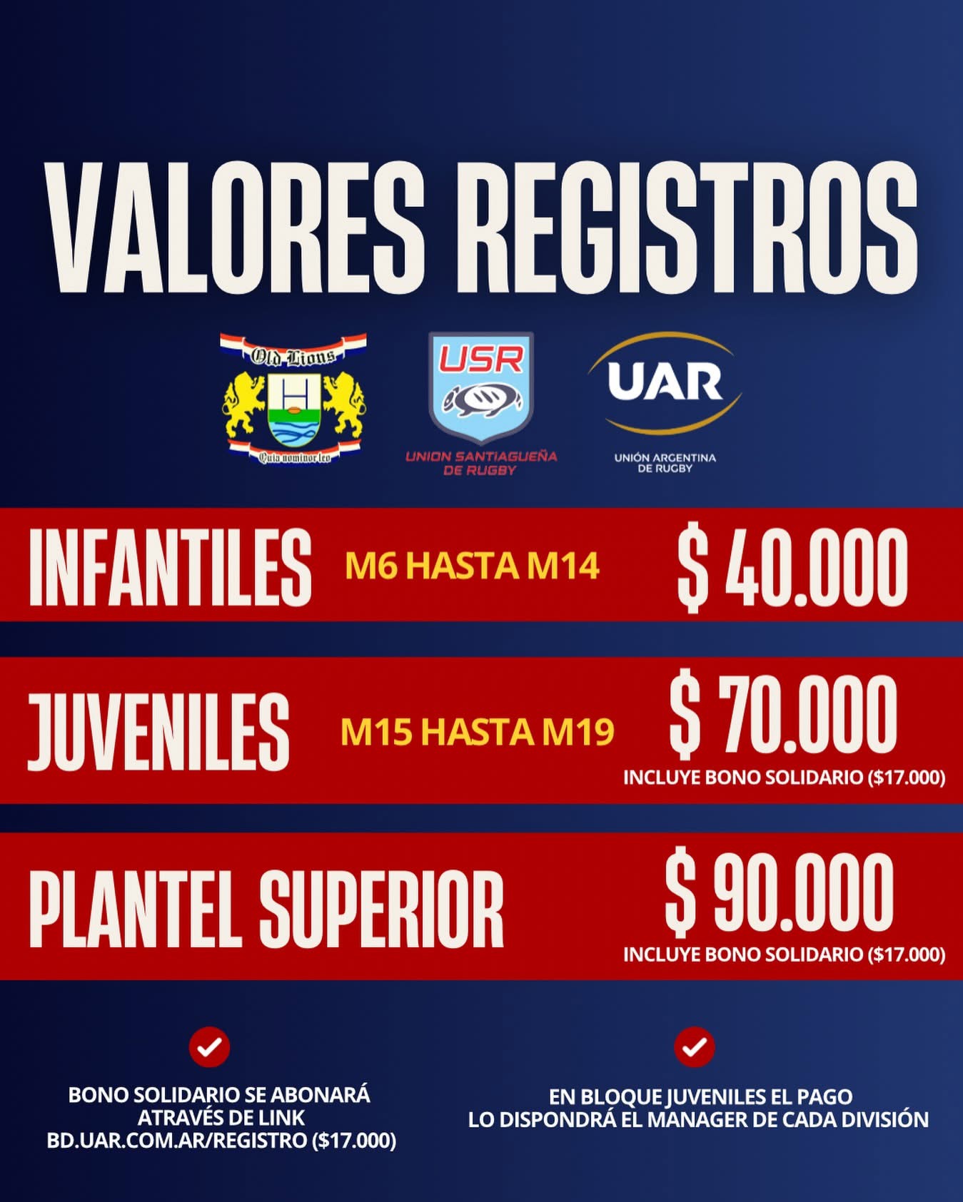 Por otra parte, se recordó que el Fondo Solidario de la Unión Argentina de Rugby deberá abonarse a través del sitio oficial (www.bd.uar.com/registro). Este pago será obligatorio únicamente para las categorías Juveniles y Plantel Superior.