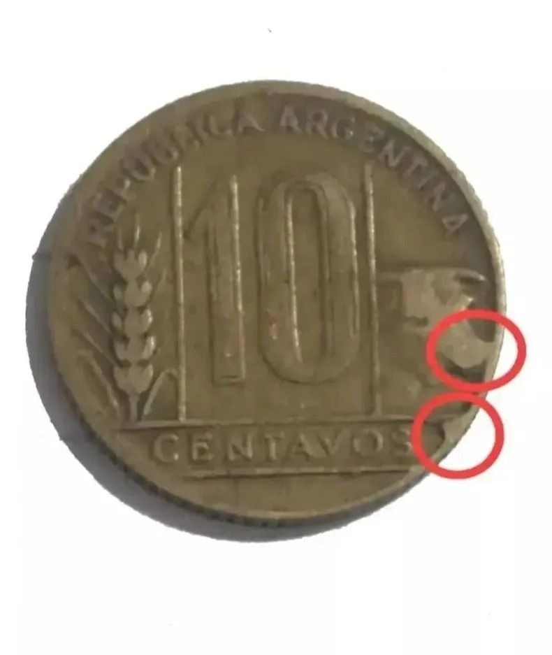 Los coleccionistas explicaron que esta moneda de 10 centavos presentó un error de acuñación muy particular. Ese fallo apareció en la boca de la vaca del diseño y también en la franja inferior izquierda, justo por debajo de la boca del animal.