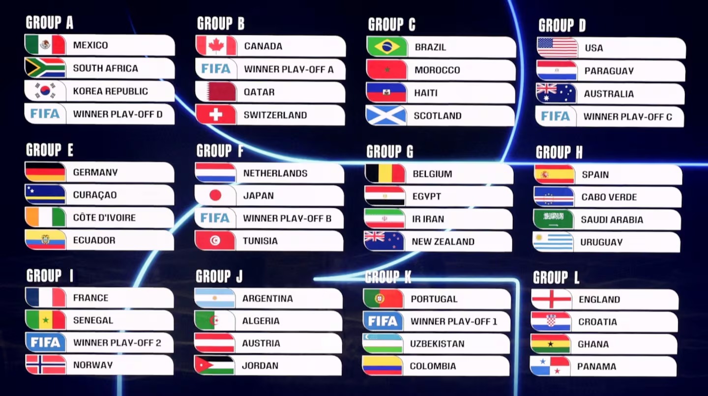 Varios grupos ya están conformados, pero los sectores A, B, D y F esperan por los ganadores del repechaje europeo, mientras que los grupos I y K recibirán a los clasificados de la rama internacional.
