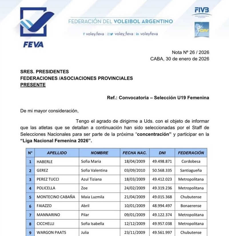 El secretario de Deportes, Prof. Carlos Dapello, recibió en su despacho a la joven voleibolista Sofía Valentina Gerez, quien fue convocada por la Federación del Voleibol Argentino (FeVA) para integrar la Selección Nacional Femenina U19 que participará en la Liga Nacional Femenina 2026.