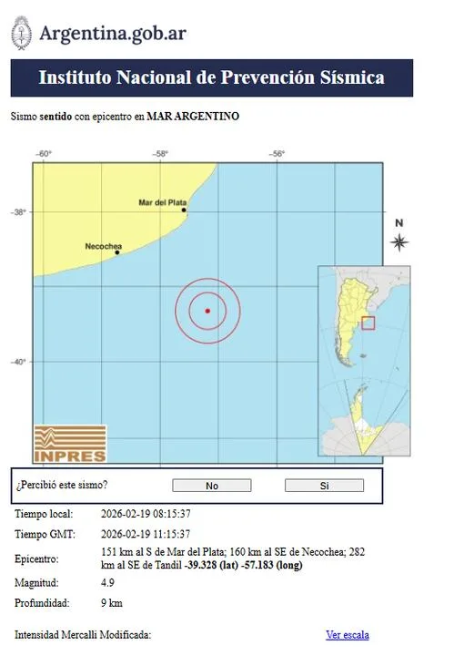 De acuerdo con datos del Instituto Nacional de Prevención Sísmica (Inpres), el movimiento ocurrió a las 8.16 y tuvo su epicentro a unos 30 kilómetros de Miramar, en una zona comprendida entre esa localidad y Chapadmalal, sobre el nivel del mar. La magnitud informada fue de 4,9, un registro poco habitual para la región bonaerense, caracterizada por su baja sismicidad.