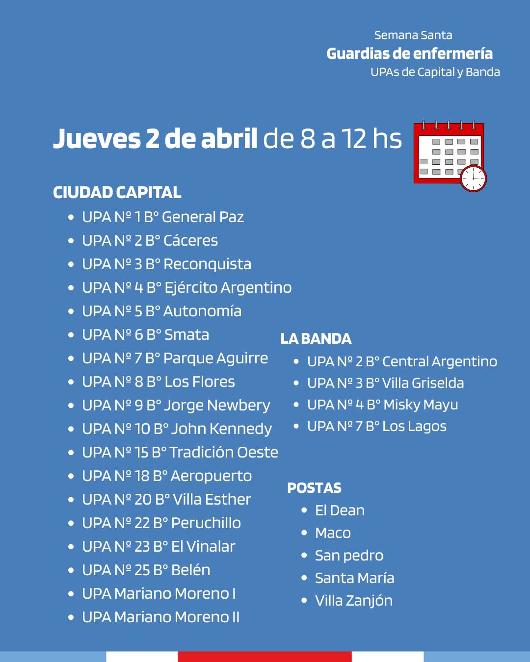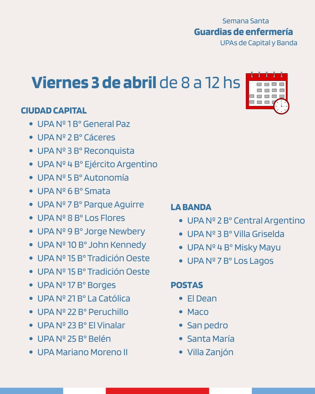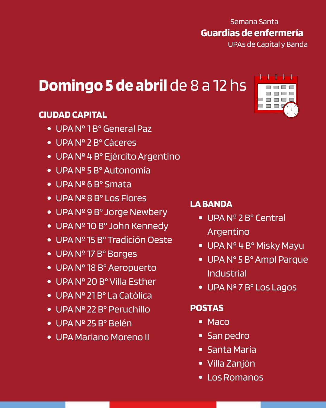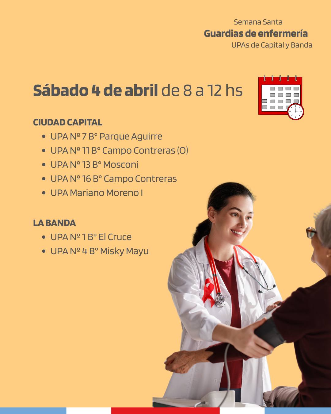 Con motivo del fin de semana largo por Semana Santa, autoridades sanitarias informaron que las Unidades de Pronta Atención (UPAs) de Capital y La Banda contarán con guardias de enfermería activas para garantizar la atención a la comunidad.