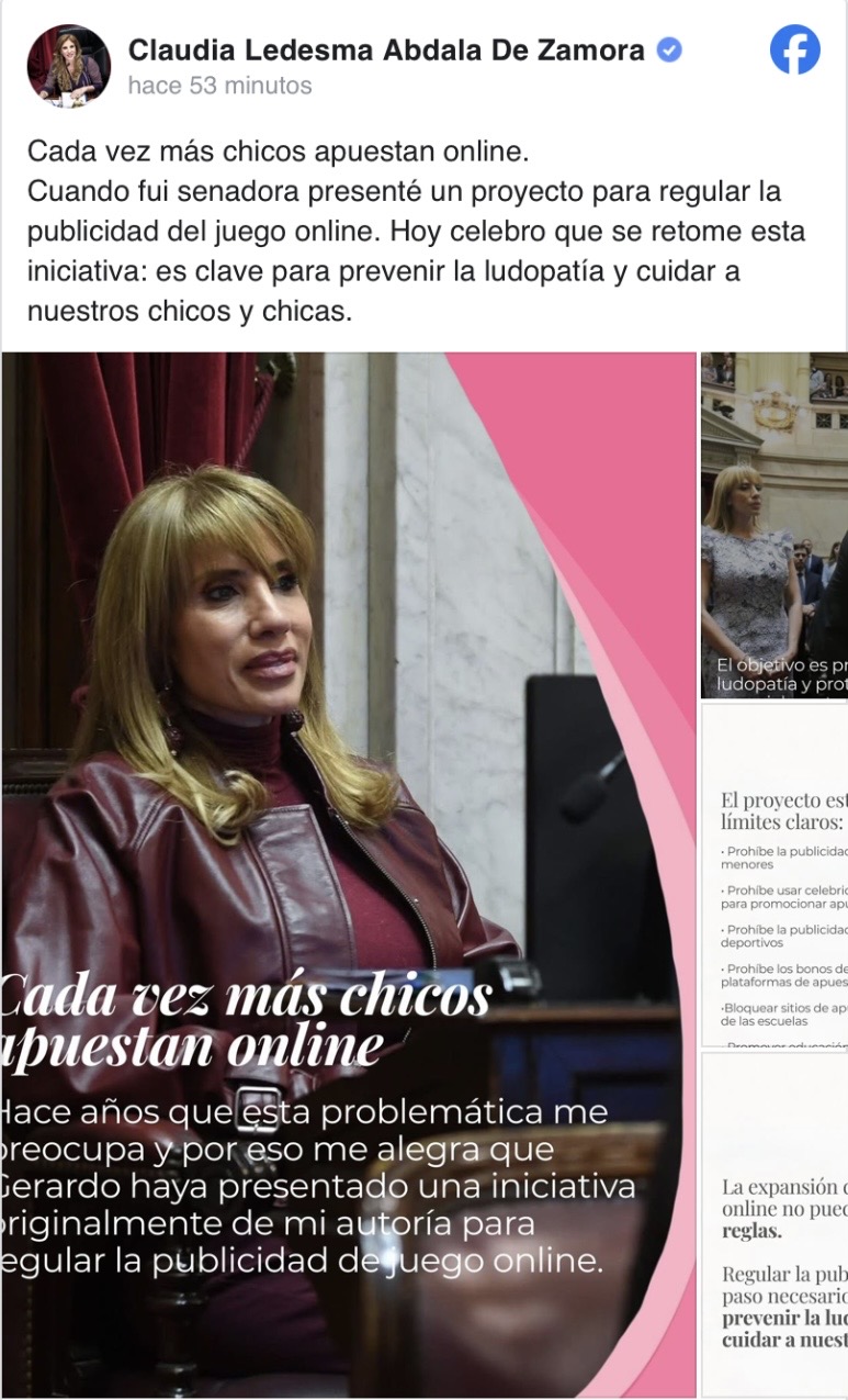 En el escrito, la expresidenta provisional del Senado menciona: "Cada vez más chicos apuestan online. Cuando fui senadora presenté un proyecto para regular la publicidad del juego online. Hoy celebro que se retome esta iniciativa: es clave para prevenir la ludopatía y cuidar a nuestros chicos y chicas".