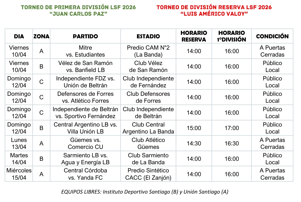 La jornada principal tendrá lugar el domingo 12, con varios cruces destacados. Central Argentino enfrentará a Villa Unión, mientras que en la ciudad de Forres se jugará el clásico entre Defensores de Forres y Atlético Forres. Además, Independiente de Fernández se medirá con Unión de Beltrán, y Independiente de Beltrán hará lo propio ante Sportivo Fernández.