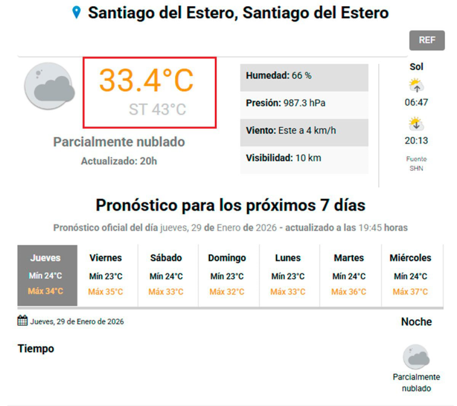 Santiago del Estero vivió una nueva jornada marcada por el calor extremo y la elevada humedad, que provocaron condiciones agobiantes incluso entrada la noche. Cerca de las 20 horas, la temperatura real rondaba los 33,4°C, pero la sensación térmica se disparó hasta los 43°C, generando malestar entre los vecinos.