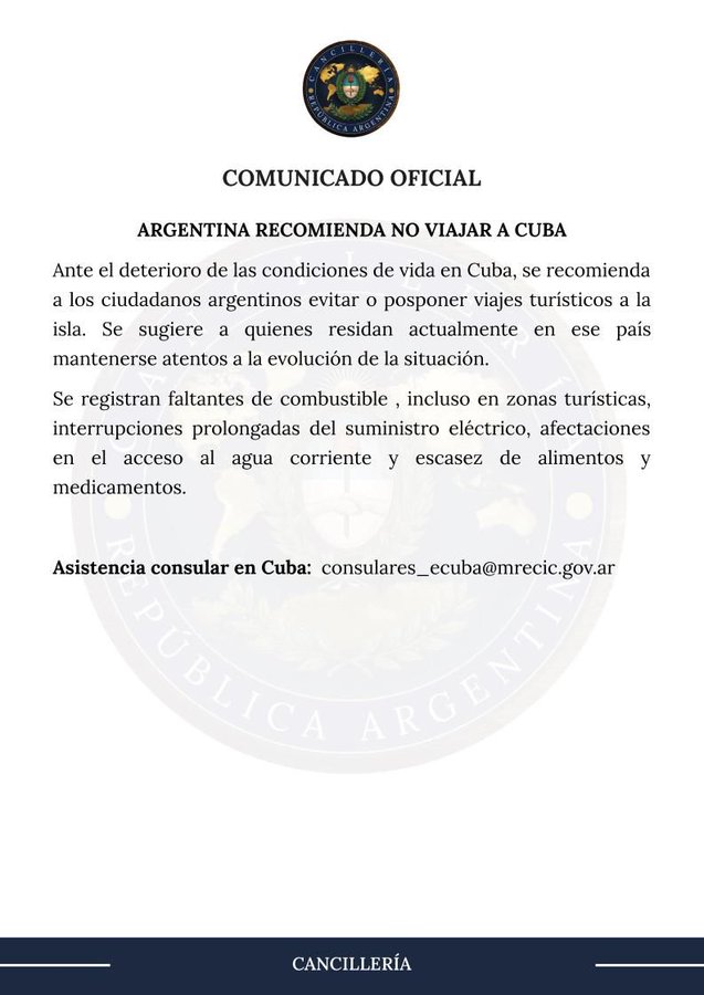 La Cancillería argentina emitió este viernes un comunicado oficial en el que recomendó a los ciudadanos argentinos no viajar a Cuba, ante el marcado deterioro de las condiciones de vida en el país caribeño.