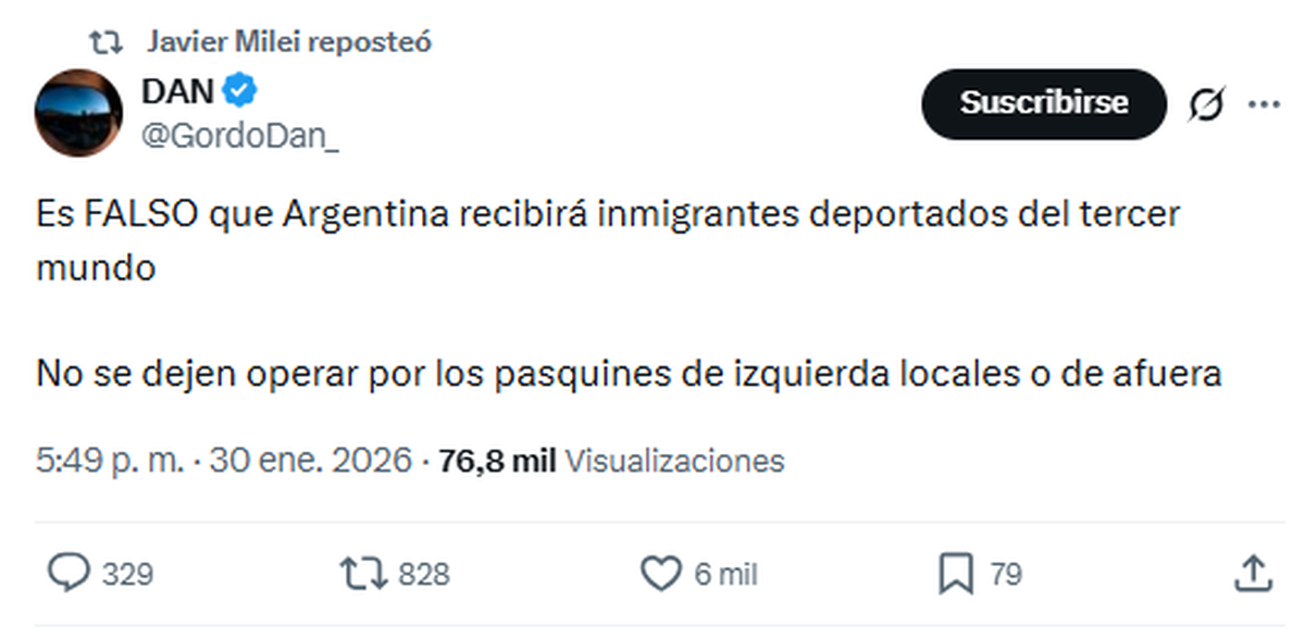 Otro usuario identificado como militante libertario, llamado Tomás Sánchez, afirmó que "es rotundamente falso que la Argentina vaya a recibir inmigrantes deportados de terceros países. No existe ningún acuerdo ni compromiso en ese sentido".